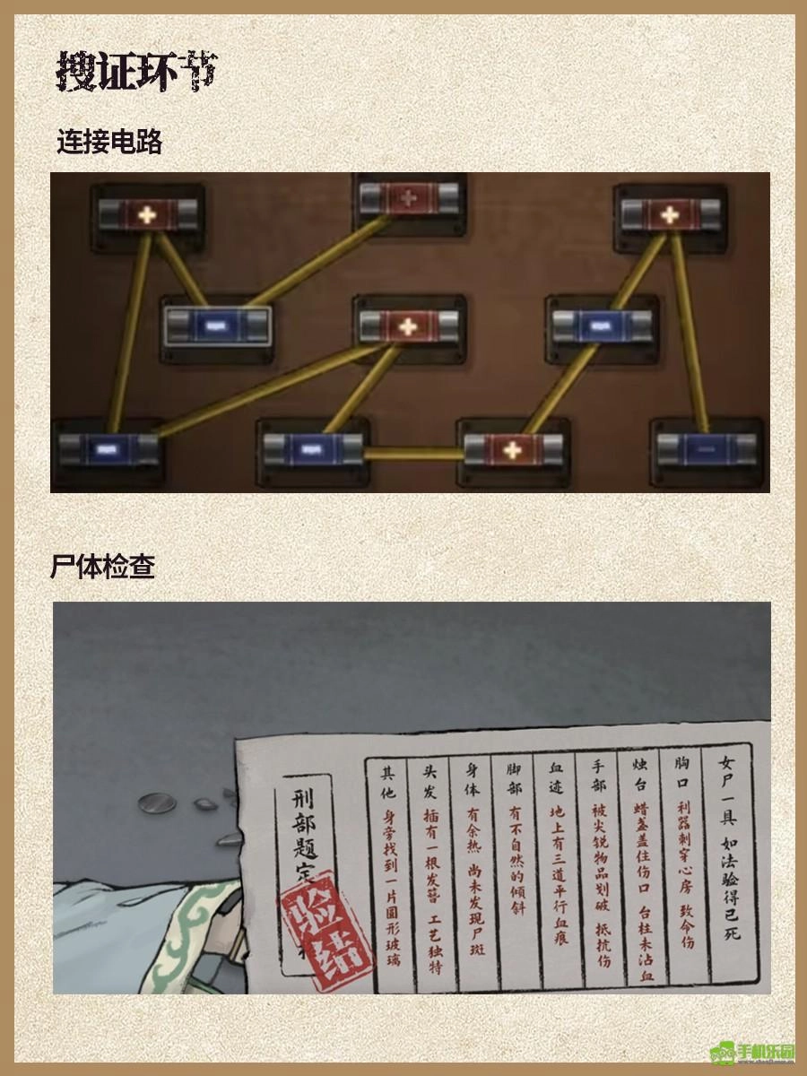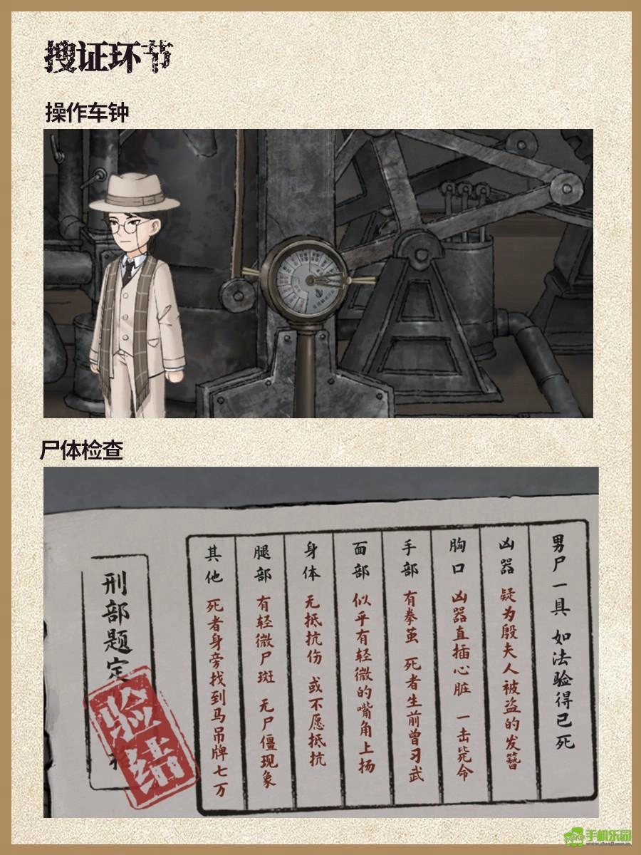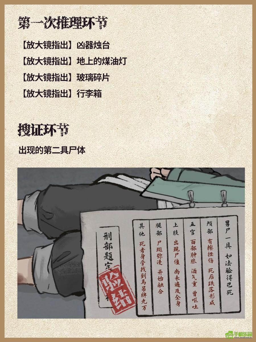 3、先调查屋内的所有物品并将其全部找齐,接着和吴德满完成对话,之后再去调查尸体,尸体共有8处需要调查的地方,具体可参考图2(包括脚部、血迹、胸口、身体、头发、手部、烛台以及其他部位)。