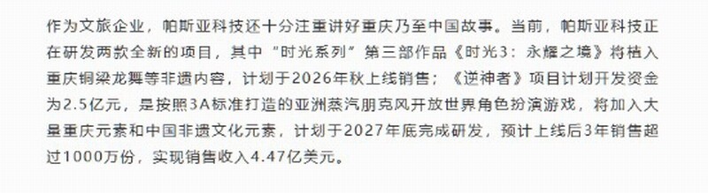 据了解,该项目拟投入2.5亿元开发资金,预计2027年底完成研发工作。按照规划,游戏上线后的三年内,销量有望突破1000万份,实现4.47亿美元的销售收入。由此可见,帕斯亚对这款游戏抱有十足的信心。