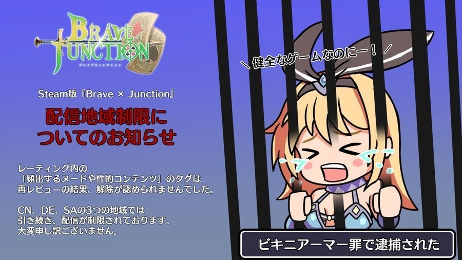 我们此前曾报道过,日本21点回合制卡牌RPG《Brave x Junction》因角色被判定为未成年人,在欧美地区遭遇下架。而现在,该游戏的Steam版本又在德国、中国和沙特阿拉伯被禁止销售。