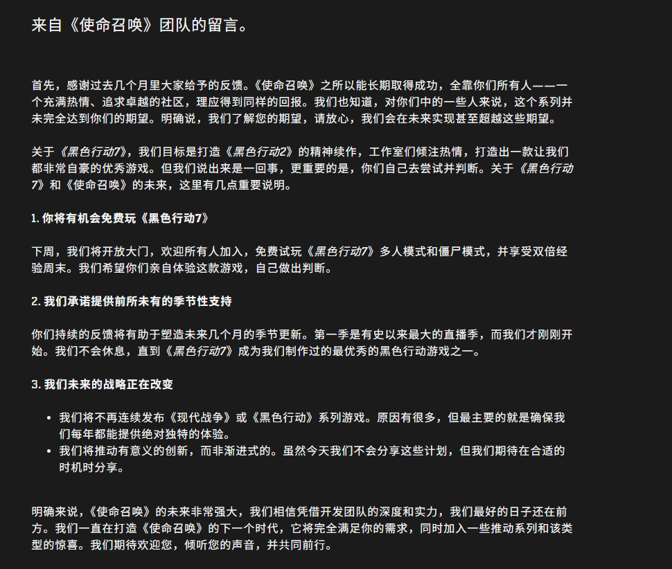 为了优化用户反馈处理机制并提升产品表现,动视宣布推出三项相关计划: