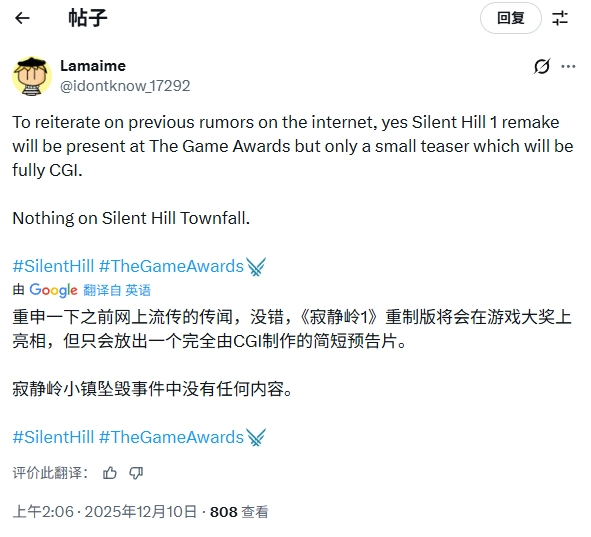 2025年TGA颁奖典礼临近,网络上又一次被形形色色的爆料与传闻所充斥。此前曾多次精准泄露《生化危机9:安魂曲》相关内容(涵盖角色设定与剧情细节)的知名爆料者Lamaime,近日对外分享了关于另一部经典恐怖系列《寂静岭》的全新消息。