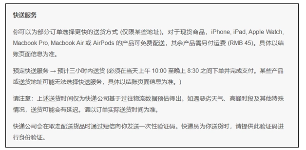 关于快送服务的时间要求,苹果官方说明,预订该服务的订单预计三小时内送达,但要满足当天上午10点到晚上8点30分之间下单并完成支付的条件。不过,因为部分产品特性或者送货地址等因素,可能没办法选择快送服务,具体能不能使用以结账页面显示的信息为准。