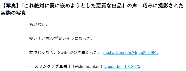 眼神不好使确实没办法,但眼睛明明没问题却懒得仔细看小字,那就很容易掉进陷阱里。12月10日,日本一位知名搞笑艺人发帖子,吐槽电商平台的套路,说自己差点花高价买了Switch 2的照片,这事很快引发了大家的关注和讨论。