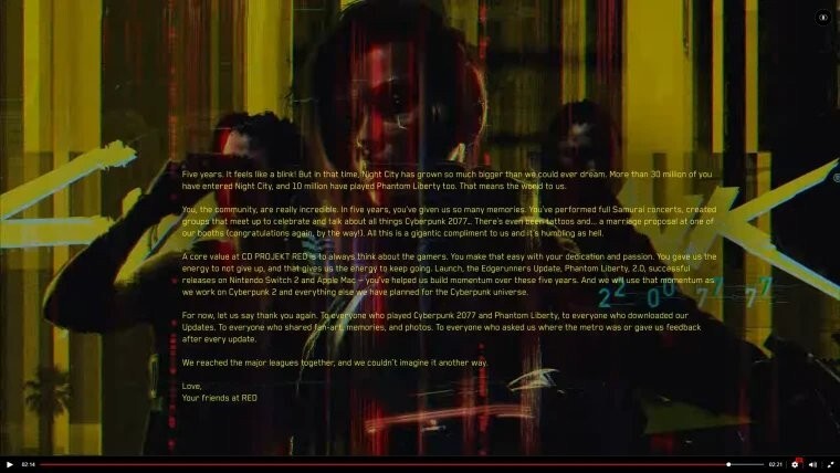 CD PROJEKT RED的核心价值始终围绕玩家展开。正因为有了你们的忠诚与热情,这一点得以始终坚守。你们给予我们坚持的力量,这份力量也激励着我们不断前行。从游戏最初的发布,到《往日之影》的推出、2.0版本的更新,再到在任天堂Switch 2和Apple Mac平台上的成功登陆——过去五年间,是你们的支持让我们积攒了强劲的发展动能。接下来,我们会乘着这股势头,全力投入《赛博朋克2》的开发,以及赛博朋克宇宙相关的其他所有规划之中。