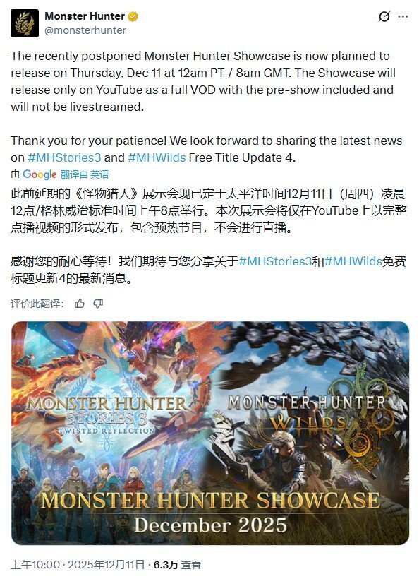 卡普空最近对外公布,之前已宣布延期的《怪物猎人》专场发布会,现已确定于北京时间12月11日16点正式推出。此次发布会会采用预先录制好的完整视频点播形式,在油管平台独家上线,不会安排直播环节。