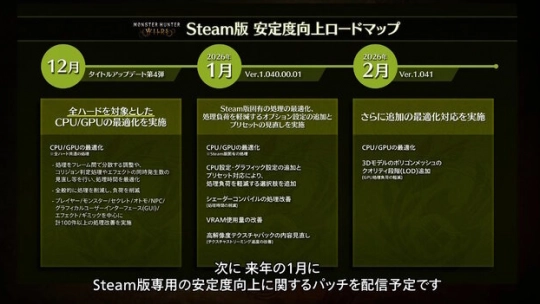 12月16日推出的免费更新将作为本作的最后一次大型更新,后续不会再进行包含多项内容的追加更新,更新重点将转向持续优化Steam版的游戏体验与修复各类问题;到2026年2月,游戏会迎来最终更新,届时会小规模新增一些内容,其中主要包括新的历战王挑战等。