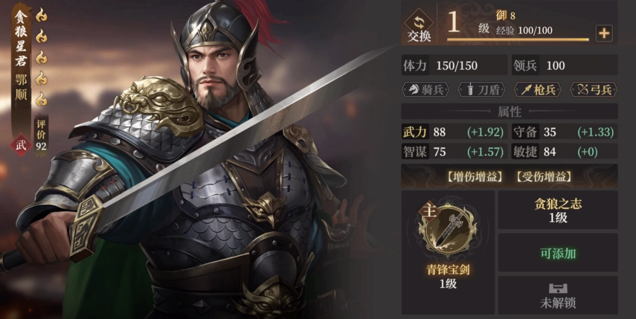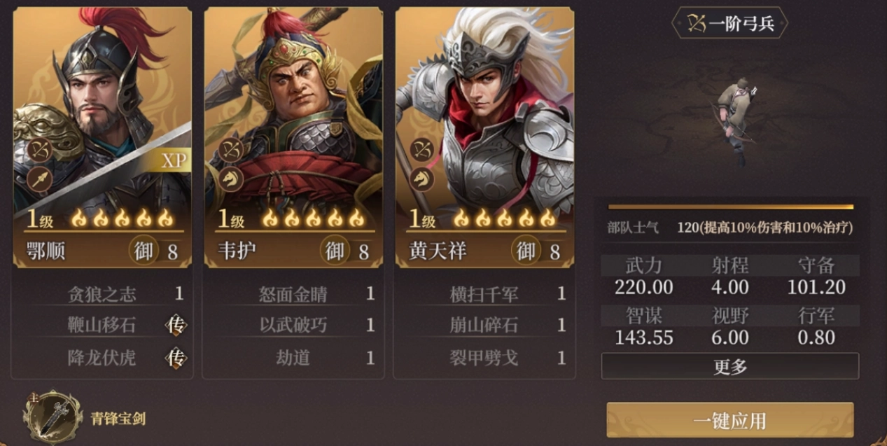 2、尽管出手不太稳,但鄂顺胜手段颇为丰富。在担任主将时,其灵宝【青锋宝剑】能够给目标附上2层庚金。要是再搭配造成流血效果的术法,几种提升武力伤害的状态便一应俱全了。即便面板属性并非十分出众,然而通过积少成多的加成,同样可以瓦解敌人的防御。