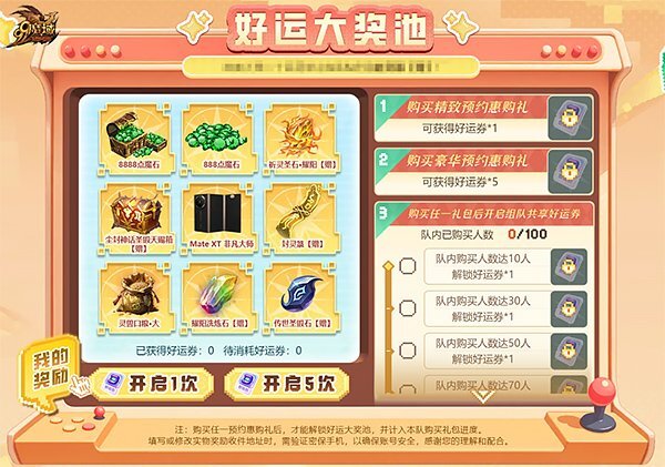 从现在开始到12月9日,参与预约活动就能和队友一起瓜分千万魔石的奖池!只要队伍人数达到10人,所有成员都能拿到封灵箓【赠】、祈灵圣石·耀阳【赠】、灵兽口粮·大等基础福利;要是神火评分符合要求,或者购买了超值礼包,还能进一步解锁魔石瓜分券。当队伍人数满100人后,队长还能在限定时间内获得“一呼百应”的专属称号!在预约这段时间里,1.6折的特惠礼包会限时上架,购买之后就能参与抽奖,有机会赢取Mate XT 非凡大师、8888点魔石等丰厚大奖;而且如果队伍里购买礼包的人数完成了目标,所有已经购买礼包的玩家都能额外得到抽奖机会,最多可以累计获得11次抽奖机会!