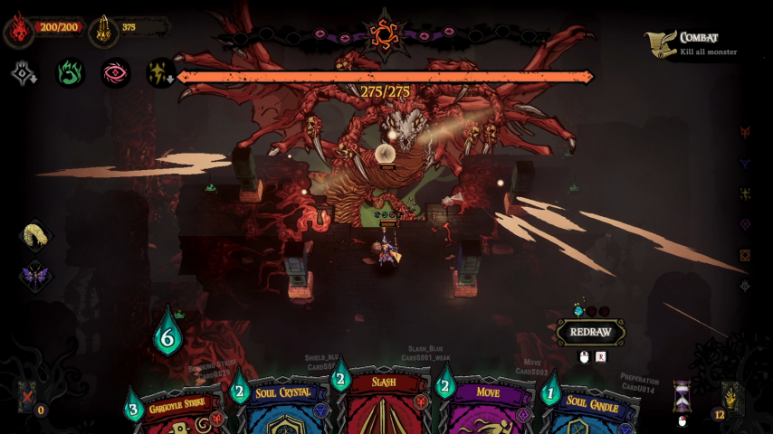 《黄金星漩》的玩法设计深度融合策略与动作元素,打造出别具一格的战斗体验。它巧妙借鉴了《Hades》的动作战斗系统与《杀戮尖塔》的卡牌构筑玩法,既延续了卡牌游戏的策略深度,又注入了快节奏动作游戏的操作爽感——玩家需在构思卡牌组合策略的同时,精准把握操作时机。此外,游戏创新加入“漩涡侵灵”机制:玩家的每一次选择都会触发相应事件,这些事件不仅左右游戏进程,还会直接侵蚀主角的意志,为战局增添更多变数。