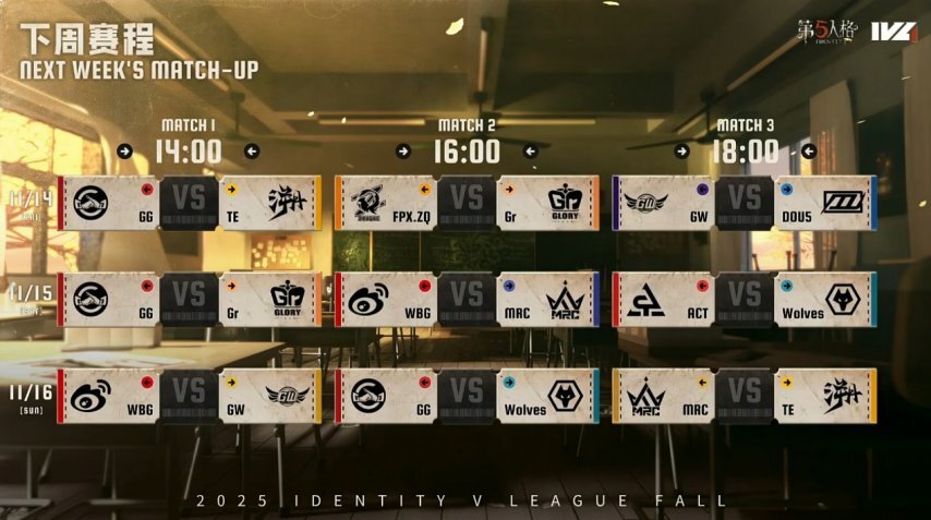 本周ACT_9u的26号守卫熟练度有待提升,身为S牌“逃脱大师”的ACT_Eleven分享了一个冷知识:带有附容返生效果的“逃脱大师”上椅后使用逃脱术,会直接失去附容返生效果,且入殓师的灵柩数量不会返还,不过这个失误没影响最终比赛结果;北京WBG战队本周连赛三场,成绩不错,WBG_N1e前期追击依旧强势,掌控节奏时势不可挡,但主动找突破口时思路略显机械,容易局限于眼前形势公式化应对,忽略对手的新策略,求生者方本周表现亮眼,面对GG_xawm带四颗炸弹的26号守卫,WBG_Huiyi闪转腾挪无伤救人,对阵TE战队时,WBG_Guoker在绕场谢幕和双重惊喜真空期灵性卡位,拉长牵制时间,一遛三台;成都GG战队求生者对阵北京WBG时,牵制和运营都稍显慌乱,GG_18的杂技演员在唐人街面对FPX.ZQ_DongX的杂货商极限走地窖保住平局,GG_xawm的“跛脚羊”凭借地形优势,用落地笼快速秒杀“逃脱大师”,但破轮的控场思路需进一步优化,GG_ppz的古董商保人表现出色,机关萧的使用都很精准;成都Wolves本周成为IVL首支累计获胜轮数达500轮的战队,Wolves_ChoAi的“跛脚羊”精准找到准备救人的咒术师,奠定快速四抓局面,Wolves_XMX在“喧嚣”舞台附近游走,两次无伤救人,为后期高效运营创造条件;DOU5_Czai本周进步明显,对阵强力监管Gr_Jin时,部署缜密、左右开弓,开门战机械傀儡自救机械师,拖出守墓人绝处逢生,让监管者顾此失彼,最终突破劣势达成平局,DOU5_mhxm对阵TE战队时,开门战移形管控大门的决策正确,可惜链爪熟练度不足,板间博弈被砸板,最终遗憾三跑;FPX.ZQ战队求生者整体配合凌乱,多次人员调动陪跑却没理想效果,最终被对手团灭;Gr战队Gr_Jin操作流畅,失误后能及时补救,后手选角场均淘汰3人以上,竞争力强,求生者阵营应对观众效应较死板,未能随机应变,且缺少拼劲,争分过于依赖监管者;GW求生者韧性较强,但监管者在角色熟练度和辅助特质携带上需改进,面对牵制力强的阵容时,不应只顾应对观众效应而选失常,需先保证击倒节奏才有失常的发挥空间;TE求生者进步显著,配合和决策更成熟,TE_Libao躲炸弹地窖逃生、TE_Drop单飞轮机械师稳健牵制、昆虫学者用虫群砸板救下拉拉队员逆转局势,都让人印象深刻,若修机速度再提升会更完美;MRC_BaiLu的杂货商对阵ACT战队时,守椅阶段快速放弃蝇头小利打出关键震慑压住遗产机,奠定胜局,MRC求生者出现漏洞时,能通过团队配合弥补,牵动监管者思路反客为主。