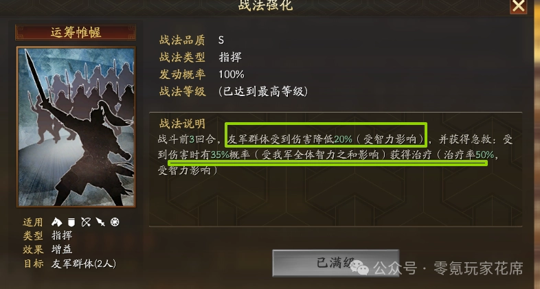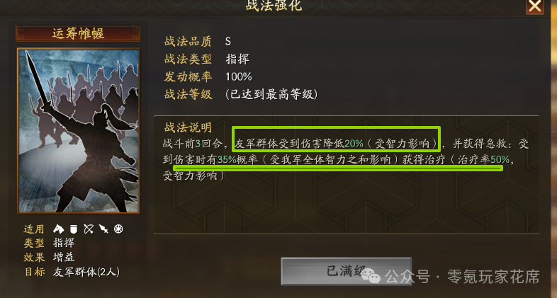 急救:35%的初始概率看似不高,但由于能获得我军全体智力属性的加成,实际触发概率可达到50%以上。