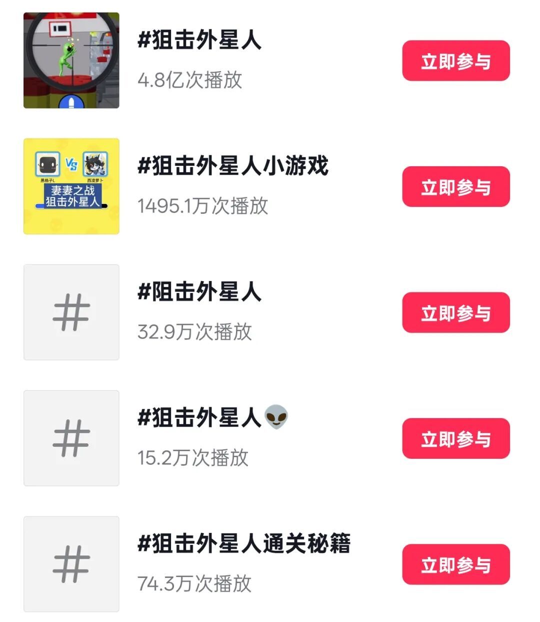 由厦门萤火科技研发的小游戏《狙击外星人》,在加入PVP对战环节后迅速走红,一举登上微信小游戏人气榜榜首。同时,这款游戏在抖音平台的热度也不断上升,相关话题的累计播放量已突破4.6亿次。