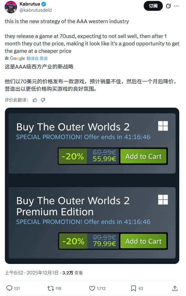 此次促销属于Xbox第一方工作室的黑五特惠活动,除《天外世界2》外,《忍龙4》《战争机器:重装上阵》《宣誓》《午夜之南》《极限竞速:地平线5》等作品也均有不同力度的折扣优惠。