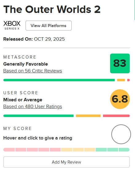 《天外世界2》于今年10月30日正式推出,其简体中文版本的玩家评价呈现出褒贬不一的态势。在597条相关评价里,仅有63%的用户给予了好评。而在Metacritic平台上,这款游戏的用户评分情况也大致相近,分数为6.8分。