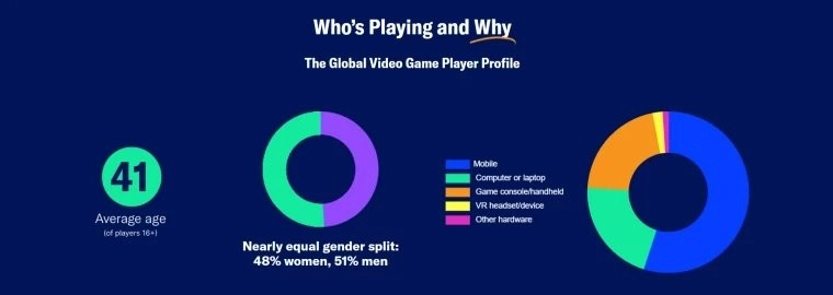 这项针对21个国家超24000人的调查结果表明,游戏社群正经历显著变化。电子游戏不再是年轻男性的专属天地,如今已成为跨越代际与性别的大众娱乐形式。