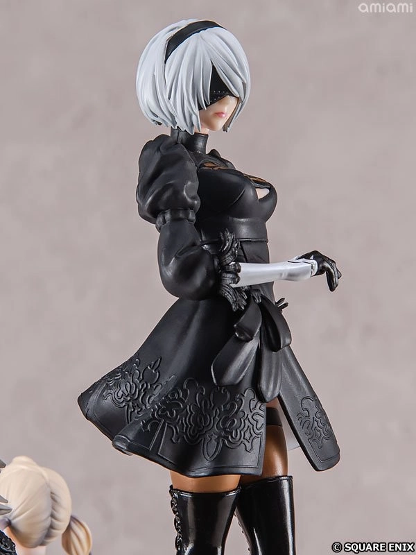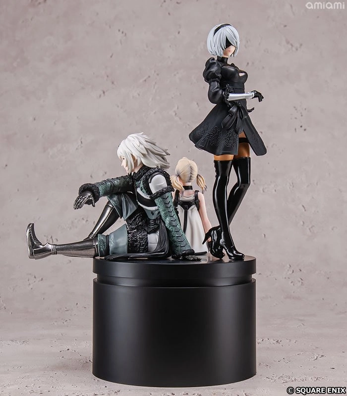 这款手办的圆形底座上矗立着系列核心主角:《尼尔:机械纪元》的人造人2B,以及《尼尔:人工生命》里的兄妹。雕塑高度大约21厘米,设计延续了横尾太郎作品标志性的黑暗美学风格。