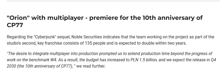 一位波兰分析师预计,《赛博朋克2077》的续作——代号“猎户座计划”(Project Orion)会在2030年第四季度推出。和原作有所区别的是,这款续作在首发时就会纳入多人游戏模式。