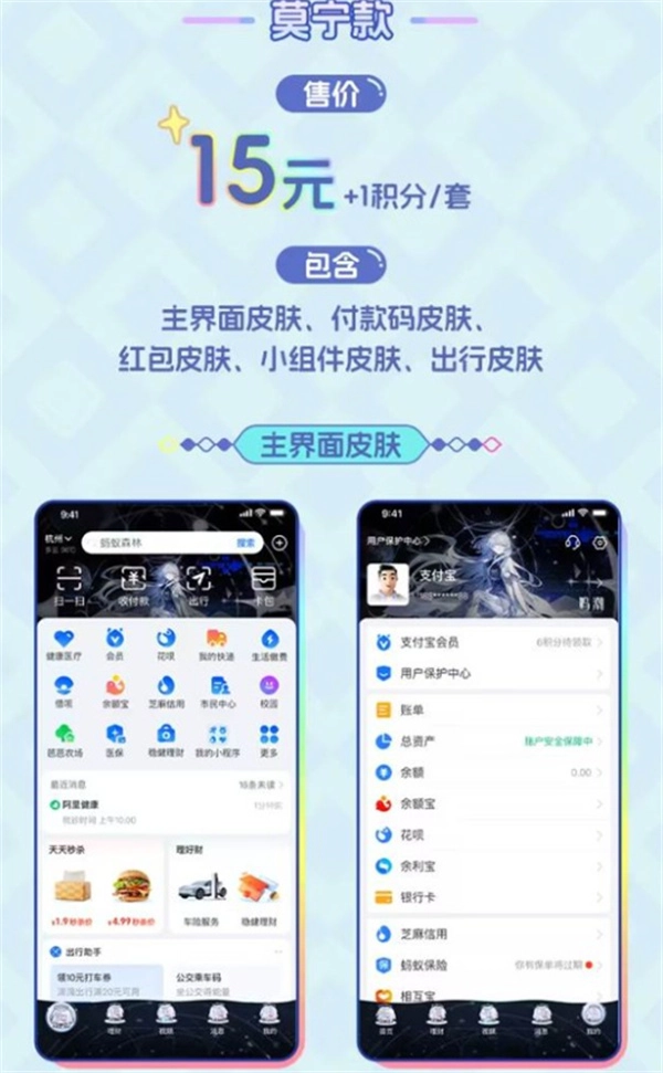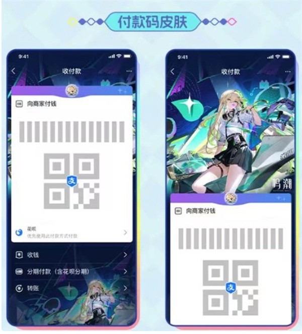 本次联动活动共上线两款动态主题皮肤,即「琳奈款」和「莫宁款」。这两款皮肤适用于支付宝的主界面、付款码、红包页面、小组件以及出行界面等多个使用场景,购买后可永久使用。