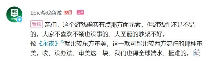 这款游戏在游玩过程中可能包含一些当前西方游戏界常用的元素,部分玩家对此难以接受,因此引发了抵制行为,甚至在官方赠送视频的评论区出现了争吵。看到这种情况后,Epic游戏商城在评论区置顶回应道:“大家要是不喜欢,不领取也没关系,大过节的吵架不太好。像《永夜》就偏向东方审美,而这款游戏可能更符合西方流行的审美风格。唉,没办法,审美这块我们得兼顾全球玩家的喜好,确实挺难的。”希望大家能够理解。