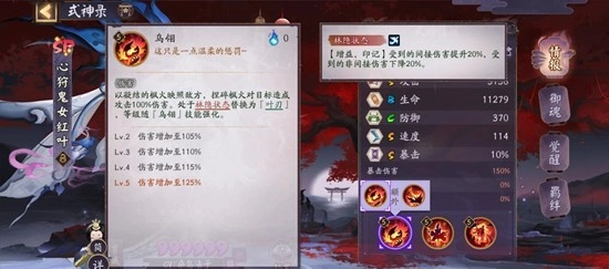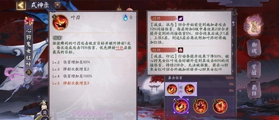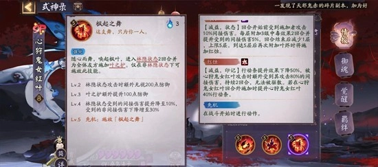三技能:进入持续2回合的林隐状态,SP红叶在此期间的攻击将无视目标防御;同时全体友方的防御属性得到提升,且友方每次受到伤害时,会对造成该伤害的来源附加1层叶烬效果。