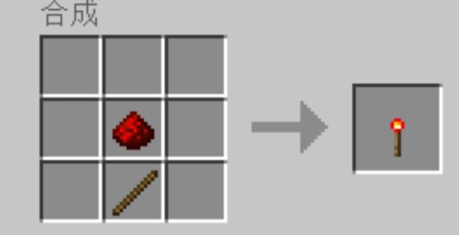 1 个红石粉 + 1 根木棍,在 2×2 网格中上下相邻放置(红石粉在上,木棍在下),一次合成 1 个红石火把。