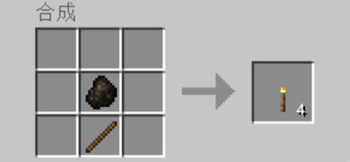 1 个煤炭(或木炭)+1 根木棍,在 2×2 网格中上下相邻放置(煤炭 / 木炭在上,木棍在下),一次合成 4 根火把。