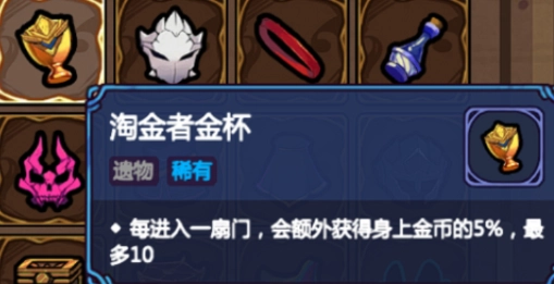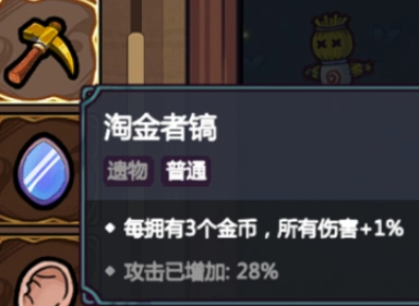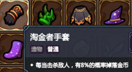 【淘金者镐】能根据自身金币数量增加伤害,但前期金币收集效率有限,搭配【淘金者手套】可以增加收益。