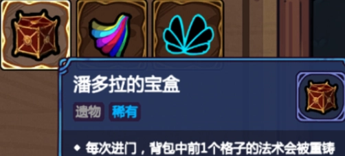 【潘多拉的宝盒】可以让你每次过图重铸一个法术,相当于每过一次图就节省重铸的金币并获得新法术,也是很不错的选择。