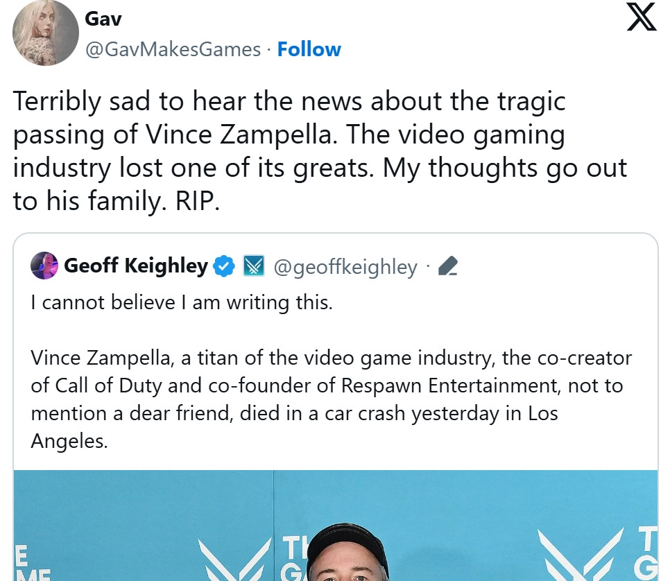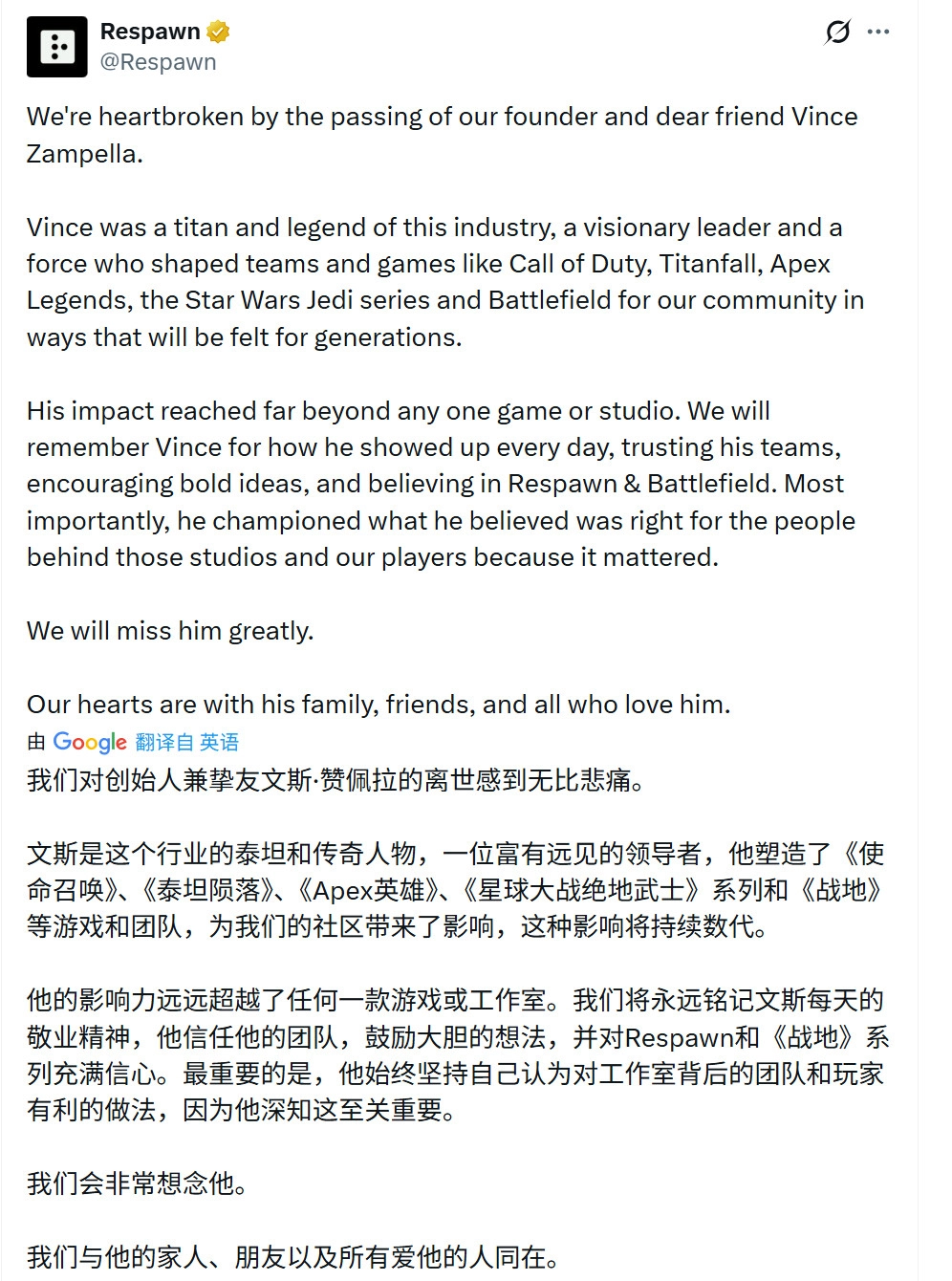 “惊闻Vince Zampella不幸离世,深感悲痛。电子游戏界失去了一位巨匠。谨向他的家人致以最深切的慰问。愿他安息。”