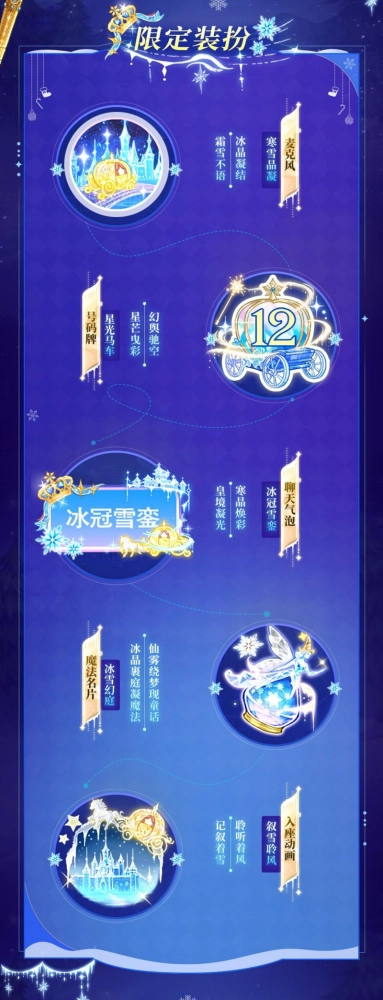 “圣诞童话”系列装扮与头像框已同步推出,此次装扮围绕童话元素展开设计,皇冠与南瓜马车在霜雪的簇拥下闪烁着璀璨星芒。