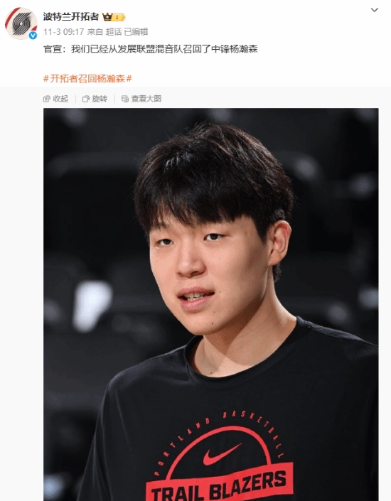 11月3日,开拓者官方发布消息称,球队已从发展联盟的混音队将中锋杨瀚森召回,以备战北京时间11月4日在主场与湖人队的对决。