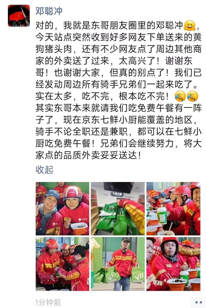 刘强东此前身着骑手服配送外卖、与骑手们围坐火锅举杯共饮,还承诺为全职骑手缴纳五险一金,这些举动早已消解了千亿老板自带的距离感。网友们乐于在订单备注里掏心掏肺地闲聊、打趣,说到底是觉得这位老板很接地气,不像那些高高在上的大人物。