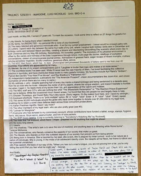 近日,网友“The Mangione Trial”称,他们已收到路易吉·曼吉奥内的回信,且已将该信件在社交媒体上公开发布。