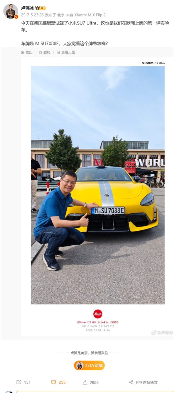 从卢伟冰分享的照片能看出,这辆SU7 Ultra有两个特别的地方:首先,它是小米在欧洲完成上牌的首辆实验车;其次,车牌号为“M SU7088E”,其中字母“M”代表着“小米”,而“SU7”正是对应的车型名称。