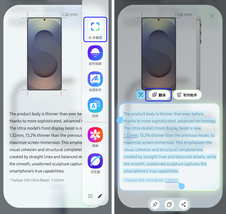 全新的“AI多截图”功能能够依据用户的行为来预判其操作意图。例如,当用户在浏览外文资料时,只需借助AI多截图圈选出文字区域,Galaxy AI就能智能识别内容,并迅速给出翻译、摘要等选项,从而提高信息处理的效率。另外,在观看短视频的场景下,AI多截图还可以直接圈选视频片段,生成GIF动图,便于用户即时保存或者分享到社交平台,让灵感创作更加自由随心。