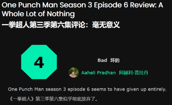外媒FandomWire于今日发布了《一拳超人》第三季第六集的评测报告,不仅仅给出4分的评分,还评价该集“充斥着毫无进展的内容(A Whole Lot of Nothing)”,并指出“动画作品需要有动态表现才能称之为动画(It Needs Animation to Be an Anime)”。以下是对该评测报告的简要翻译整理: