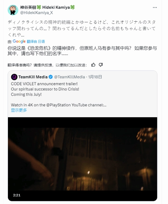 值得一提的是,这款作品在今年年初曾自称是“《恐龙危机》的精神续作”,这一说法引起了知名游戏制作人神谷英树的不满,他直接发文质疑“有原班人马参与其中吗?”