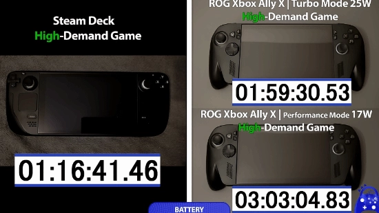 在电池续航方面,ROG Xbox Ally X在不同模式下分别实现了3小时和接近2小时的续航表现,相比之下Steam deck的续航仅为1小时16分钟,两者在电池续航上存在较大差距。