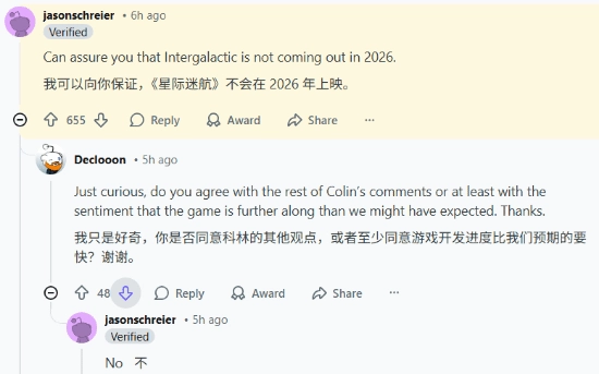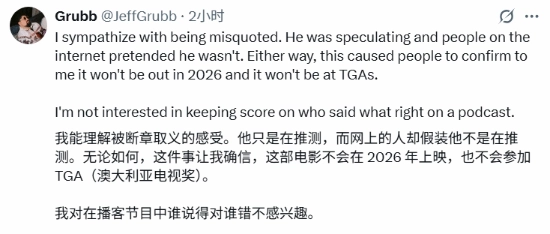 Jason Schreier最先在社交媒体上表示,这款游戏“2026年不会发售”。紧接着,Jeff Grubb补充透露,该作不仅2026年不会推出,就连2025年的TGA颁奖礼也不会现身。至于事件的始作俑者Colin Moriarty,则回应称自己的原话被断章取义了,那仅仅是他的个人看法。