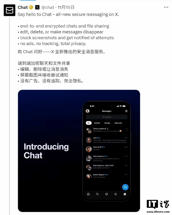 另外,X平台全新的私信功能——Chat已宣布于11月15日正式上线。官方表示,Chat是一项安全的消息服务。