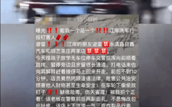 一位女士因临时停车去接孩子,中途接到挪车电话返回时,意外发现旁边汽车生活馆的员工正在她的车轮下放置铁钉。
