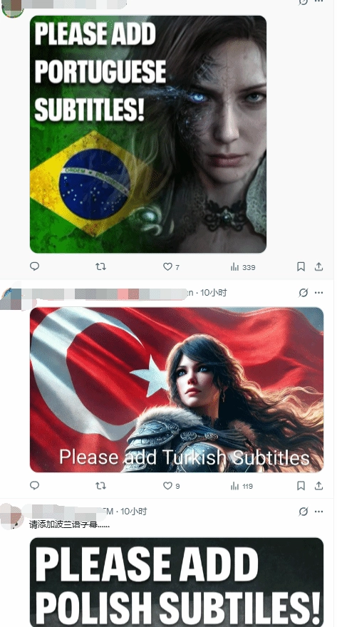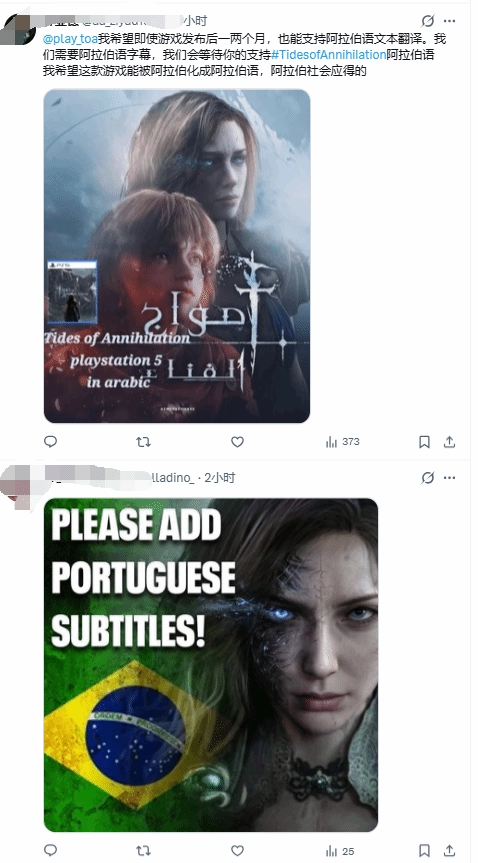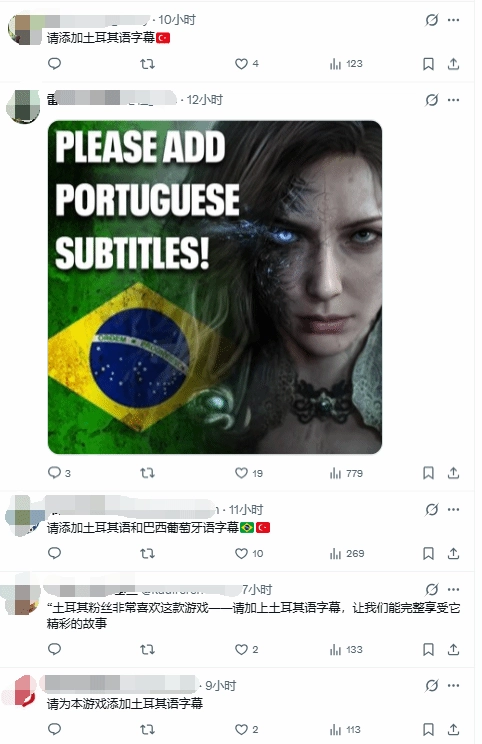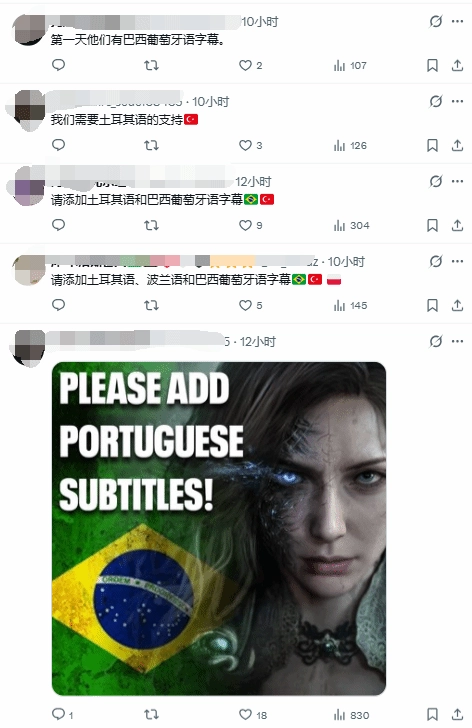 于是推特上出现了这样一番奇景:《湮灭之潮》官方账号的每条动态下方,都有国外玩家刷屏留言,请求游戏支持当地语言。起初巴西玩家的呼声最为高涨,如今土耳其玩家的热情也十分高涨。