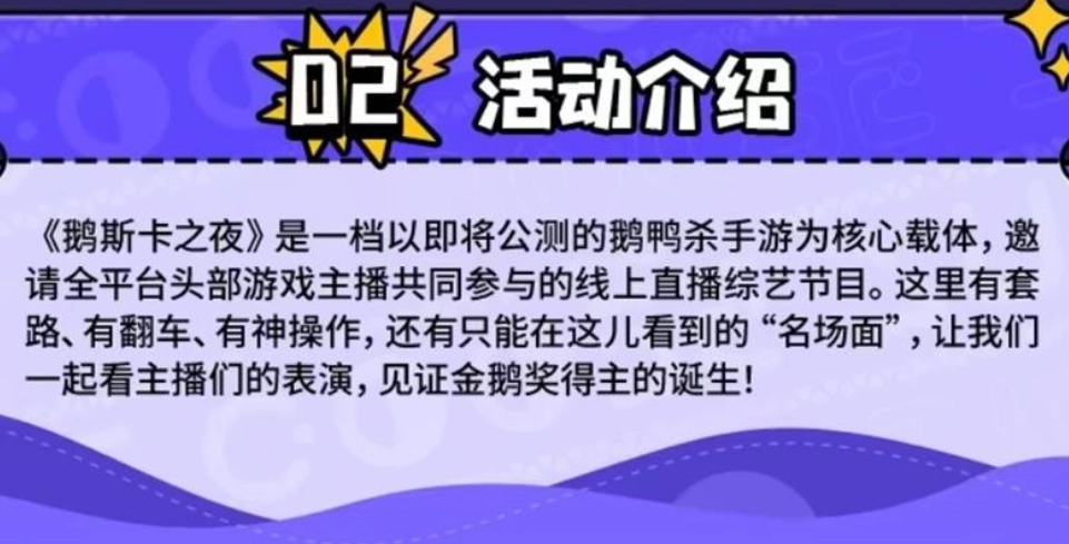 《鹅斯卡之夜》是一档围绕即将开启公测的鹅鸭杀手游打造的直播综艺节目。节目会邀请全平台的头部游戏主播齐聚一堂,为观众呈现充满套路、翻车瞬间与神级操作的精彩内容,更有独家限定的“名场面”在此上演。快来一同见证金鹅奖得主的荣耀诞生吧!