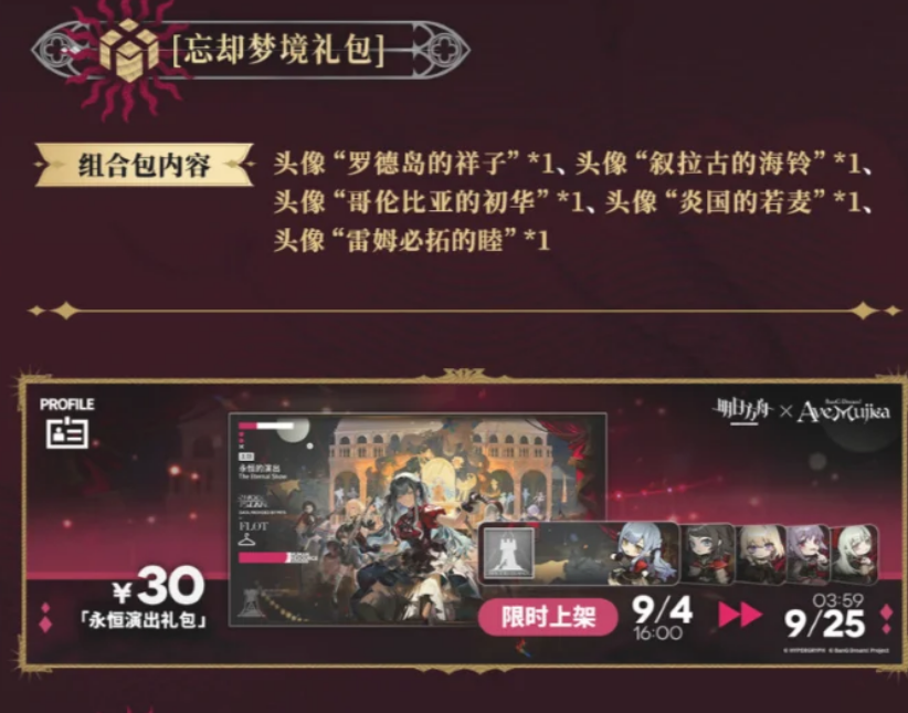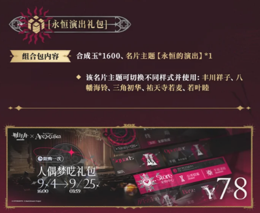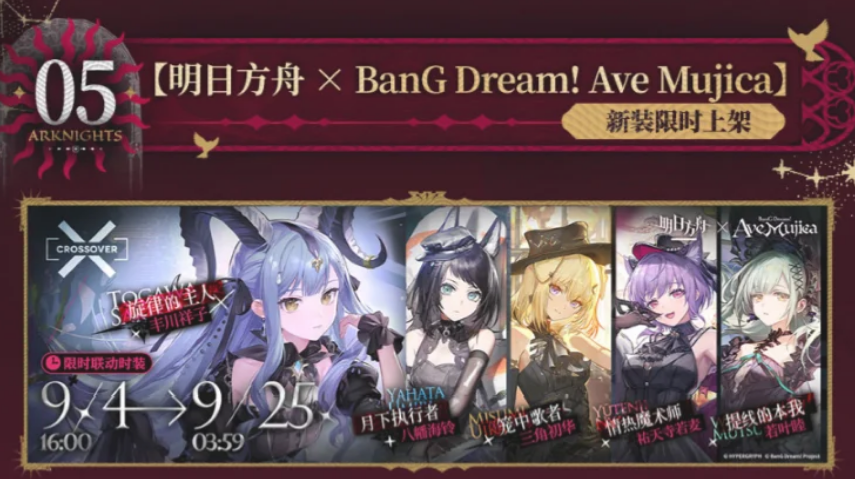 09月04日16:00至09月25日03:59期间,以下干员的新增时装将在时装商店限时上架贩售: 【CROSSOVER】系列 - 旋律的主人 · 丰川祥子 【CROSSOVER】系列 - 月下执行者 · 八幡海铃 【CROSSOVER】系列 - 笼中歌者 · 三角初华 【CROSSOVER】系列 - 情热魔术师 · 祐天寺若麦 【CROSSOVER】系列 - 提线的本我 · 若叶瞳 ※ 本次【明日方舟 × BanG Dream! Ave Mujica】联动时装不支持使用【时装自选凭证】兑换。