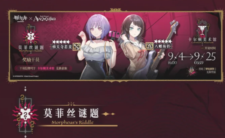 时间09月04日16:00至09月25日03:59 兑换规则:活动进行期间,玩家能够通过参与活动关卡【演出大厅】与【莫菲丝谜题】的战斗获取「梦境拼图」,使用该道具可兑换【卡尔顿美术馆】内的各类物品。