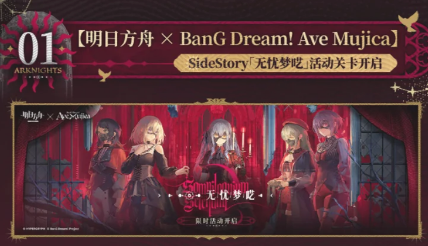 近日,《明日方舟》官方正式宣布将与《BanG Dream! Ave Mujica》开启联动主题SideStory——「无忧梦呓」!本次联动的宣传PV已同步释出,迅速吸引了广大玩家的目光。这场限时活动定于9月4日至9月25日期间举办,期待与各位在这片大地上,共同镌刻下独属于我们的声音与回忆!