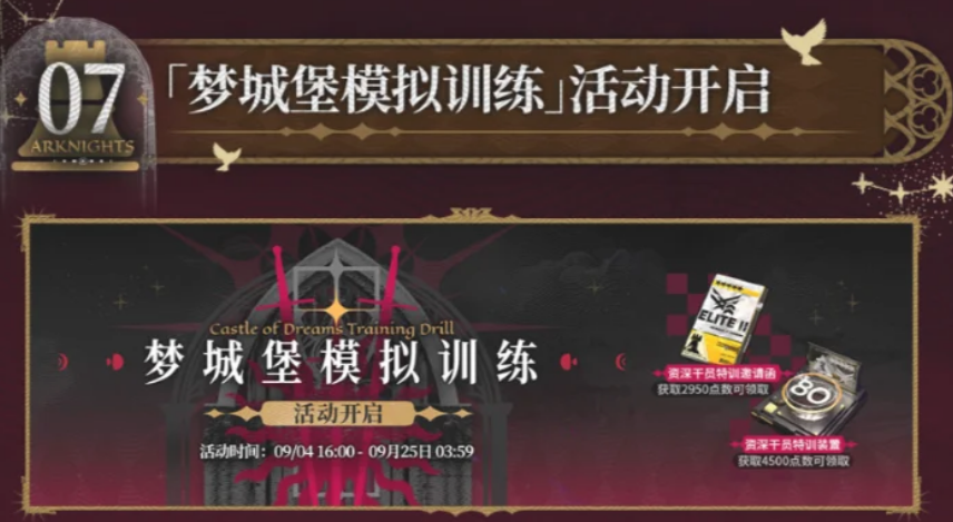 时间09月04日 16:00 - 09月25日 03:59解锁条件通关主线0-11活动说明活动期间玩家可通过完成限时任务获取特殊兑换点数,累计获得指定点数可获取资深干员特训装置、资深干员特训邀请函等奖励。奖励资深干员特训装置、资深干员特训邀请函、专业干员特训装置、专业干员特训邀请函、养成素材、龙门币、作战记录等。该活动结束后将回收溢出点数(超出4500部分),回收比例为:1点数=20龙门币,将通过邮件进行折返。