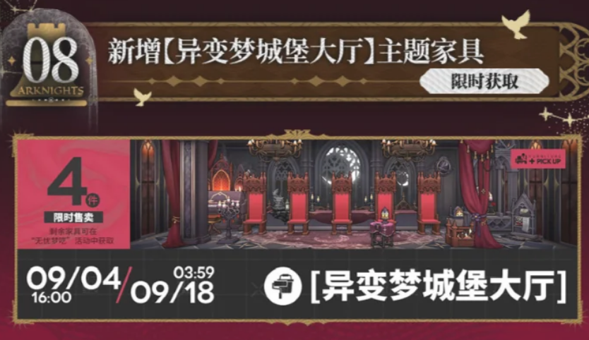 活动期间新推出的活动限定家具【异变梦城堡大厅】系列,可通过以下方式获取:无忧梦呓活动奖励及兑换(部分)、家具商店限时售卖(部分)。其中,家具商店的限时售卖时间为09月04日16:00至09月18日03:59。