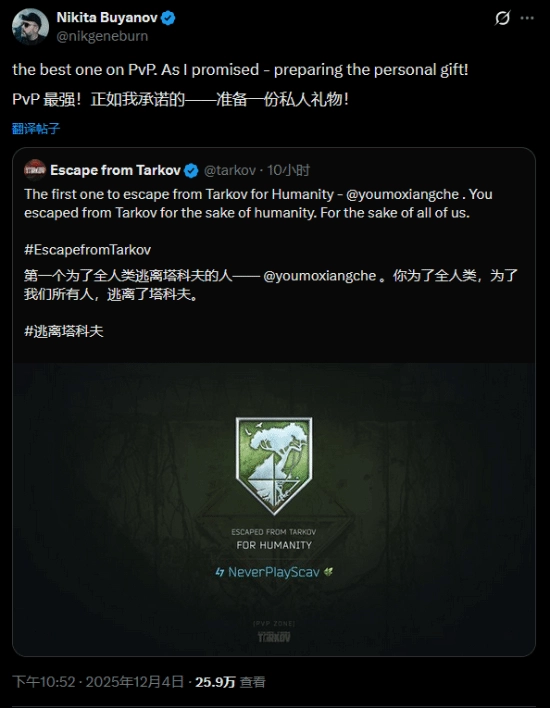 消息公布后,《逃离塔科夫》官方证实了该消息的真实性,游戏总监尼基塔(Nikita Buyanov)称会为他准备一份私人礼物,还把@油墨香车称作“PvP最强之人”。