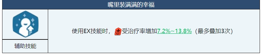 接下来我们看看小夏的ex技能,这个技能仅需3点费用,释放后能为小夏自身回复178%~338%的生命值,并且可以解除自身的一个减益状态。这种技能机制比较常见,它的优势在于能够恢复一定血量,对于作为前排的小夏而言,这是个相当实用的技能,能及时为自己补充生命值。
